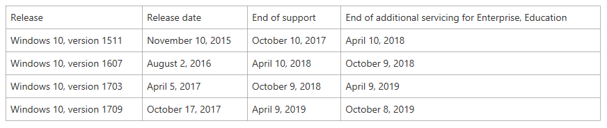 2 – Le support des versions de Windows 10 passe de 18 à 24 mois pour la version Entreprise (colonne de droite) :
