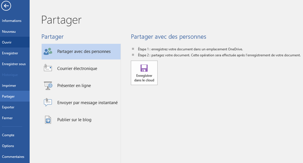 Ce client permet quelques intégrations supplémentaires dans Office, comme la partage de fichier via One Drive for Business :