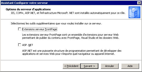Tout d'abord dans l'Assistant, cliquez sur Ajouter ou supprimer un rôle : ![]() Sur la page Rôle du serveur, cliquez sur Serveur d'application (IIS, ASP.NET), puis sur Suivant.