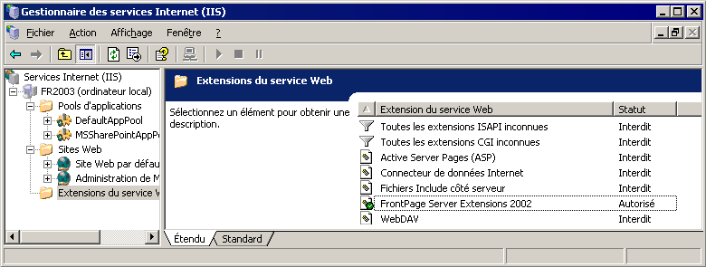 Voici la liste des extensions autorisées (j'ai activéldes Extensions Frontpage 2002, qui sont aussi désactivées par défaut). Comme vous le voyez IIS est ultra-bridé de cette façon