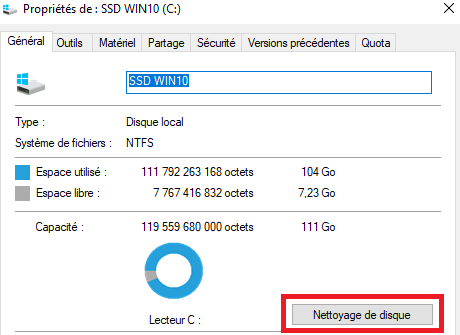 1 – Dans l’explorateur de fichiers, cliquez sur le disque C, puis Propriétés