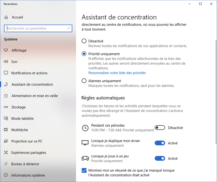 L’assistant vous permet de planifier des périodes de concentration automatiquement, soit en fonction de l’heure ou de la duplication de votre affichage, par exemple.