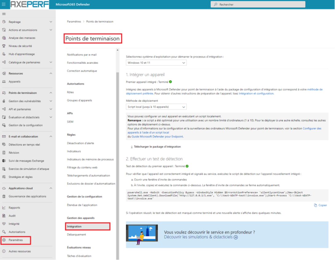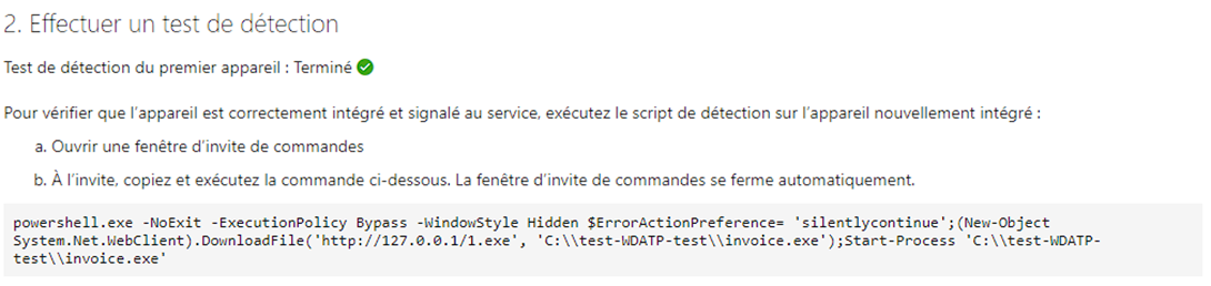 Outre le fait de voir apparaitre le PC dans la console, Microsoft fournit un exemple de script simulant une attaque, et déclenchant Microsoft Defender :