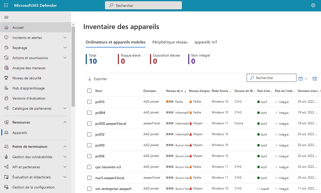 Intéressons-nous à la page permettant de visualiser les PC gérés et leur état : menu Ressources / Appareils :