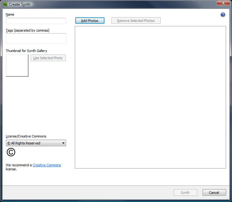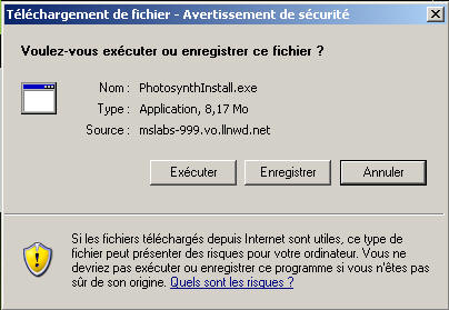 L'installation démarre : Cliquez sur Exécuter et confirmez l'installation. Vous devrez ensuite vous connecter avec votre compte LiveID, l'écran suivant apparait : 3 - Création de votre Photosynth : Cliquez sur Start a new synth, l'écran suivant apparait : Cliquez sur Add Photos et importez vos photos, pensez ensuite à renseigner le nom (Name) les mots clefs (Tags) puis à sélectionner la photo qui servira d'aperçu pour votre Synth (Thumbnail for Synth Gallery) Cliquez maintenant sur le bouton Synth Tous va maintenant se passer automatiquement : puis Extracting images features, (lecture des