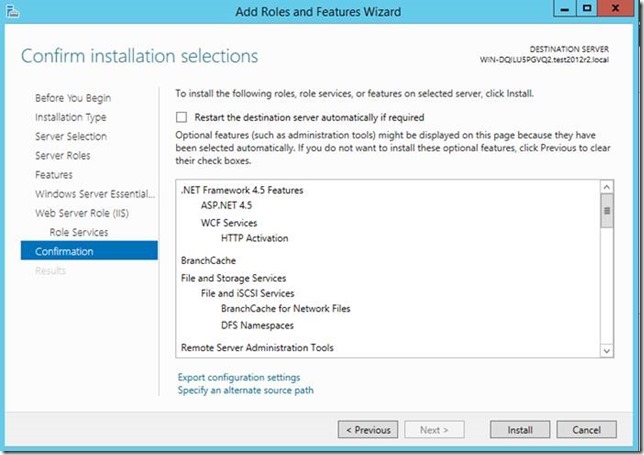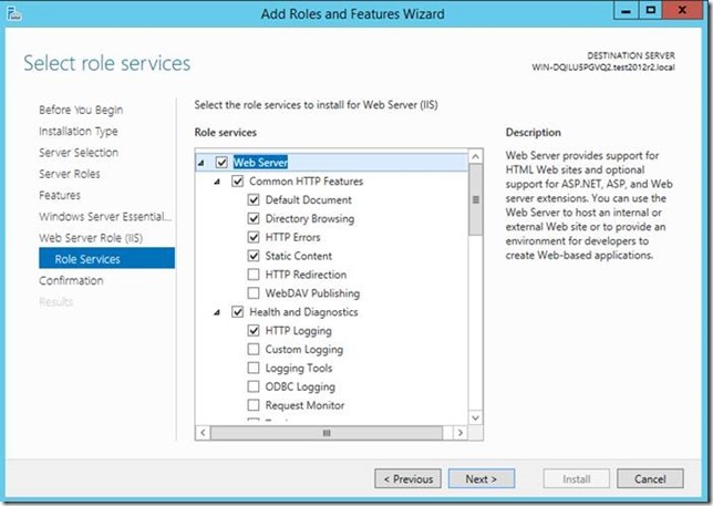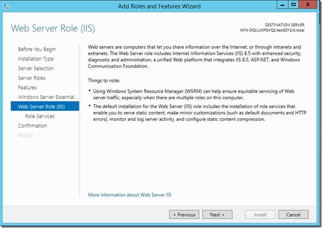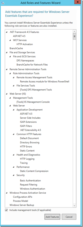Le rôle IIS est activé avec de nombreuses fonctionnalités, pour permettre aux services web de Essentials de fonctionner :